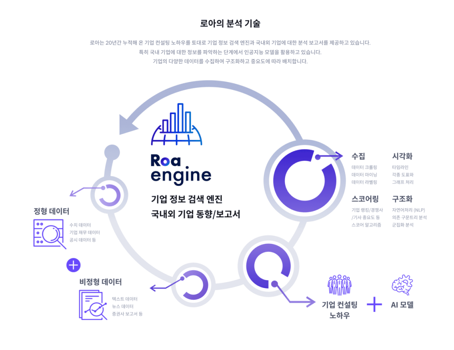 로아인텔리전스가 제공하는 '로아엔진' 서비스는 국내외 다양한 소스들을 기반으로 데이터를 수집하여 제공하는 차별화된 데이터 분석 플랫폼입니다. 이 서비스의 주요 특징은 다음과 같습니다.